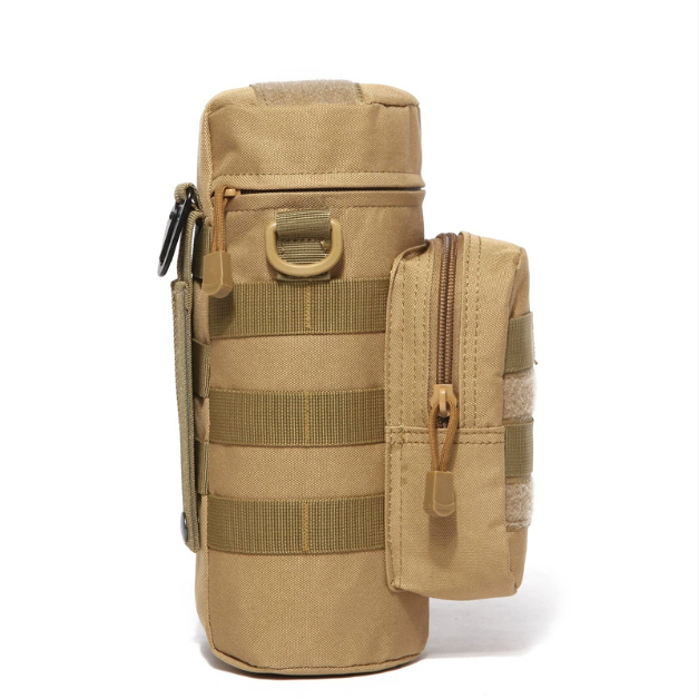带上这款户外MOLLE战术水壶袋,为您的下一次冒险做好准备!这款耐用的水壶袋采用高密度尼龙材质,可轻松连接到任何MOLLE织带背心、包袋或背包上,确保您随时都能取用饮用水。主拉链袋可容纳大型运动水壶,而侧拉链袋则非常适合存放小型装备和配件。